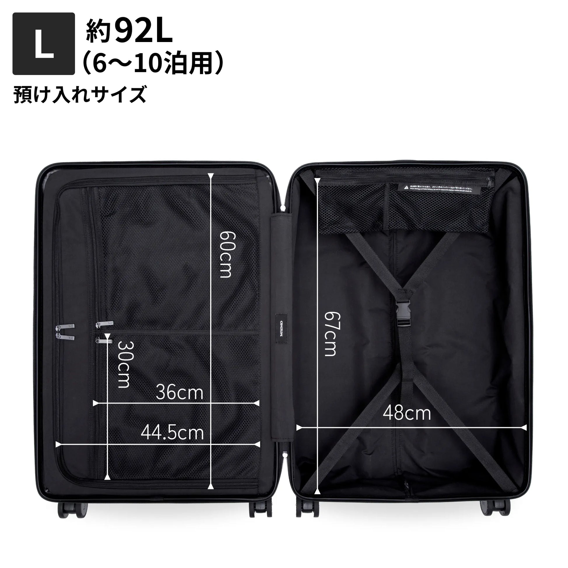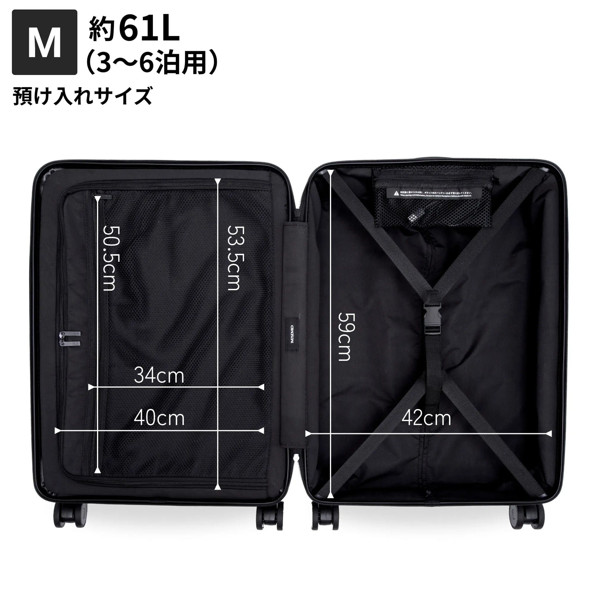 ■航空機の貨物室に預け入れる際(チェックインする際)は、スーツケース内部から必ずモバイルバッテリーを取り出し、機内にお持ち込みください。