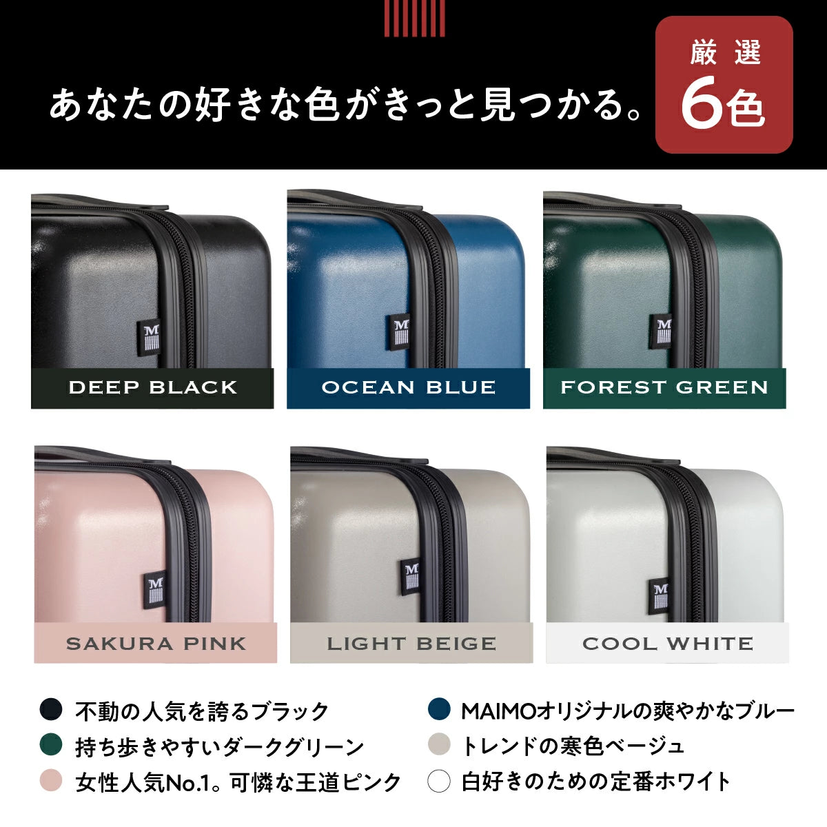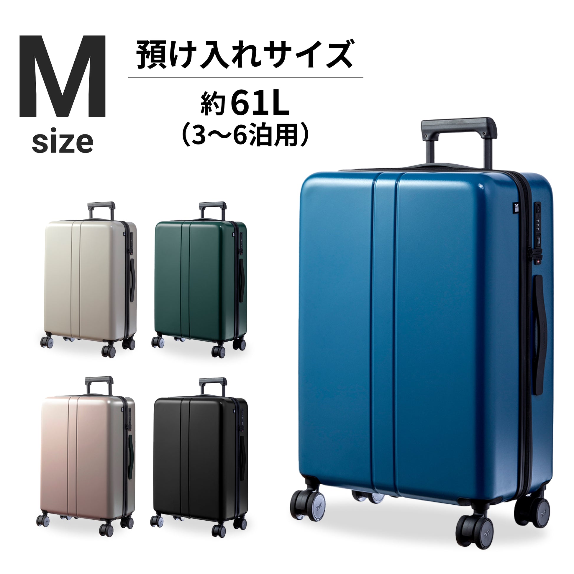 ファスナータイプ/TSA ロック(最新モデル 008)/3段階調節キャリバー/55mm 直径静音タイヤ/取り外し可能キャスター/クロスベルト/USB ポート搭載(Type-A)/キャスター交換用六角レンチ付属/Q&Aつき取扱説明冊子付属/ご購入者様限定サイト