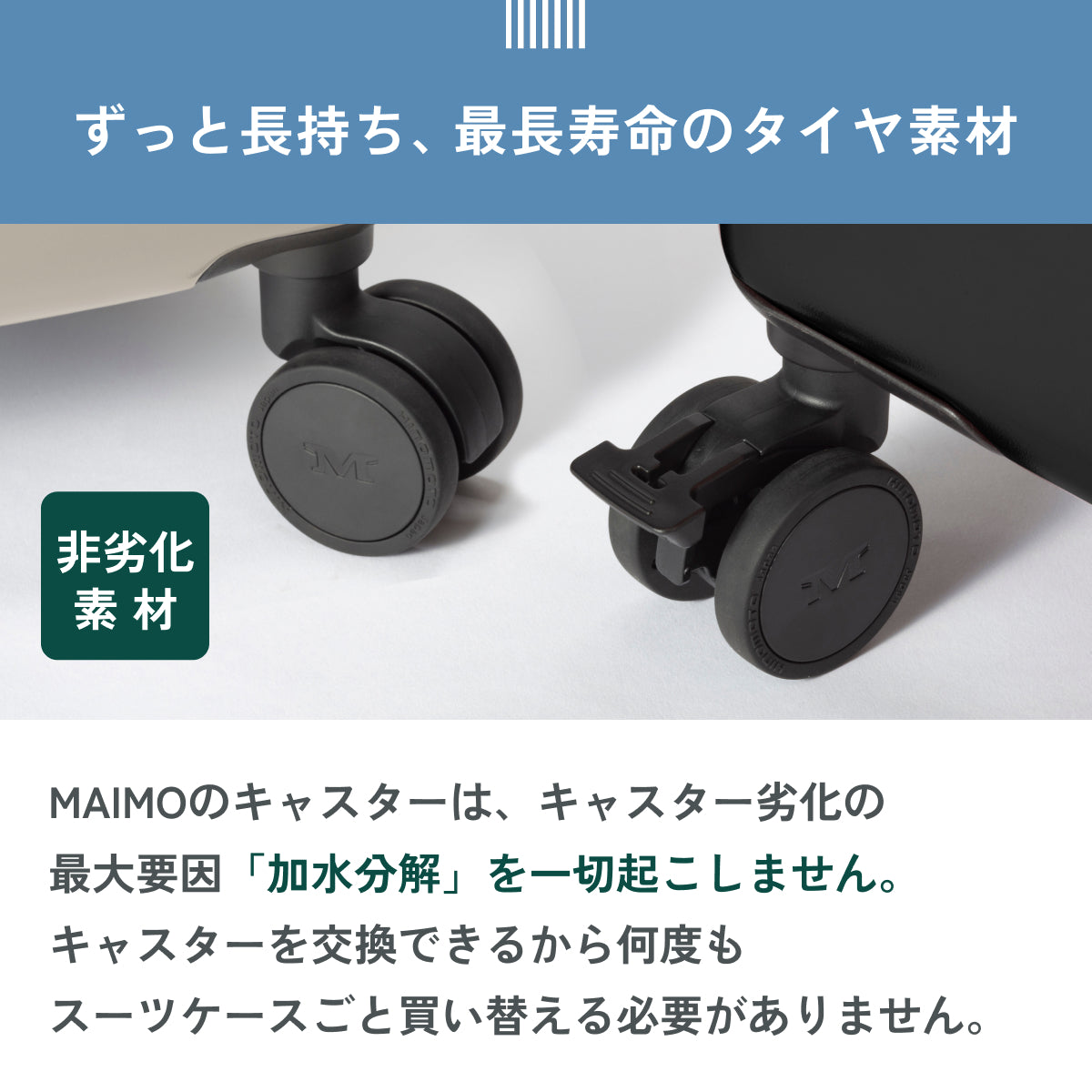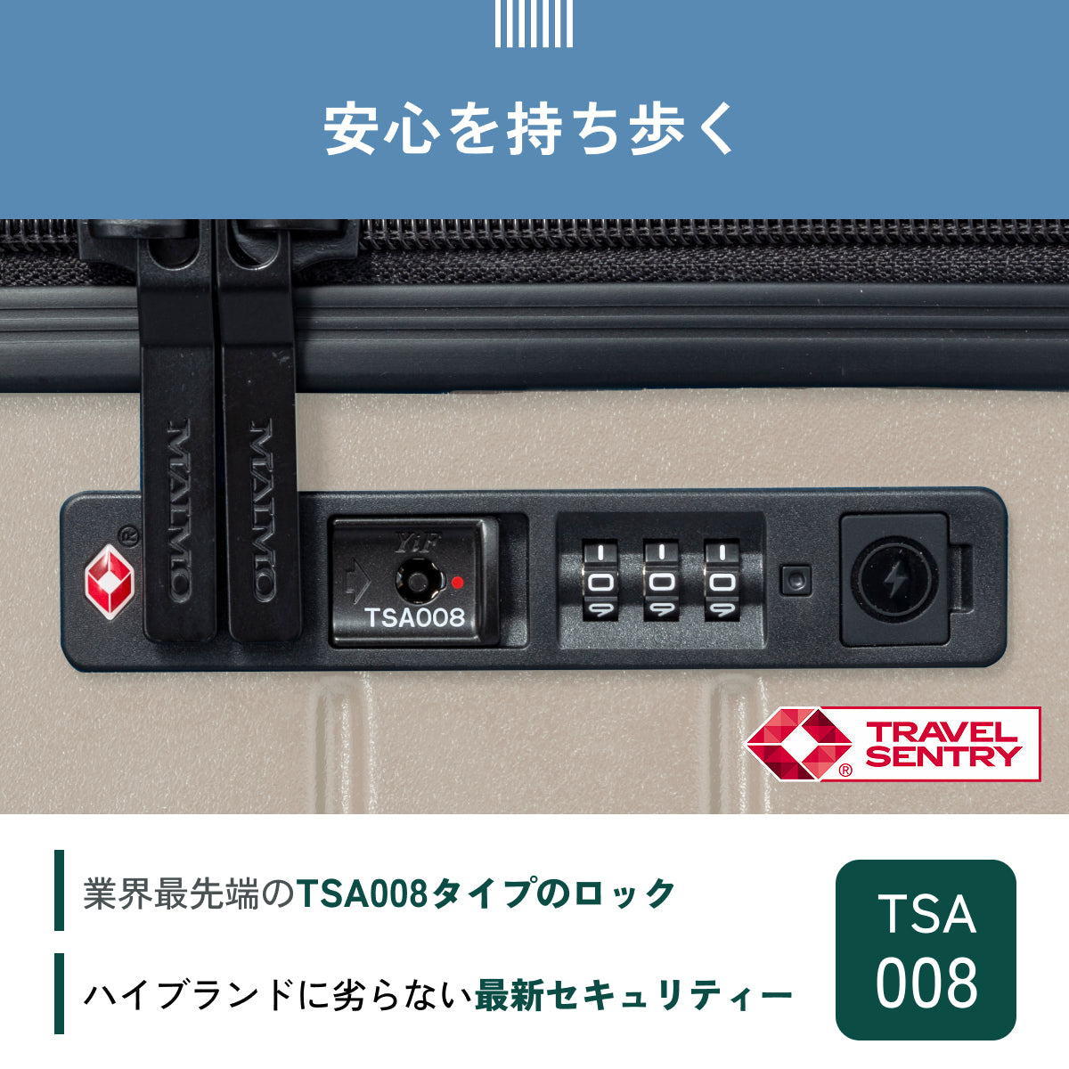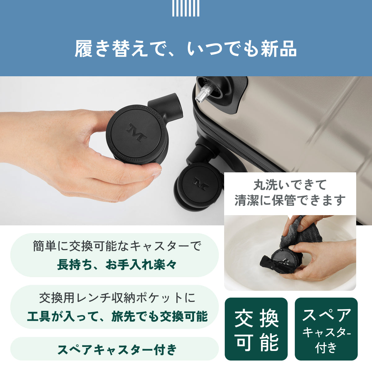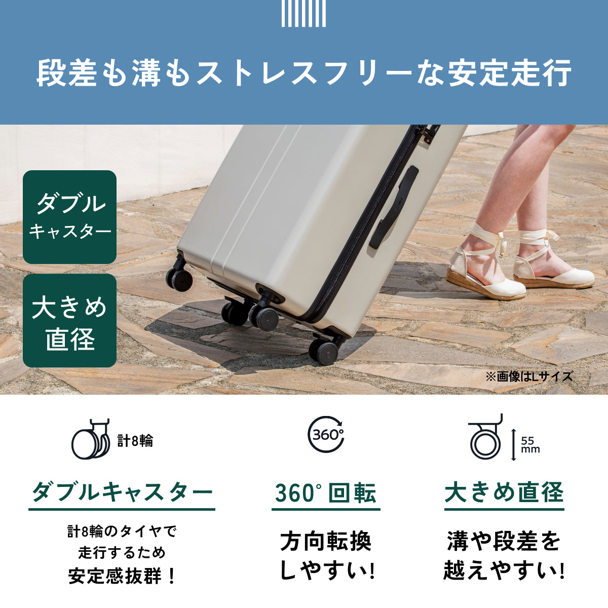キャスターストッパー/ファスナータイプ/TSA ロック(最新モデル 008)/1cm単位調節キャリバー/55mm直径静音タイヤ/取り外し可能キャスター/スペアキャスター付属/両面仕切り付き内装/マチつきポケット/クロスベルト/USB ポート搭載(Type-A)/キャスター交換用六角レンチ付属/Q&Aつき取扱説明冊子付属/ご購入者様限定サイト