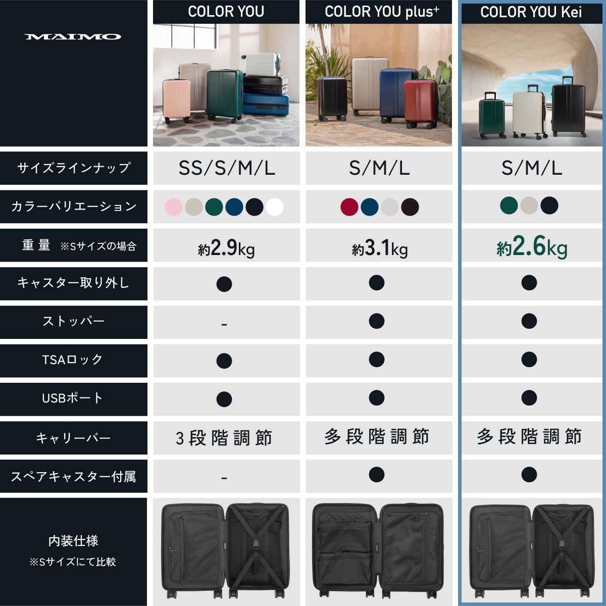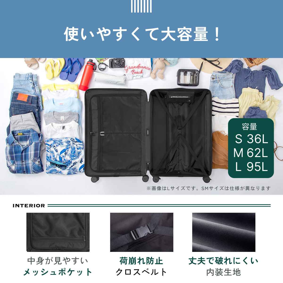- ※Sサイズは国際線及び100席以上の国内線航空機内に持ち込み可能なサイズです。※100席以下の小型機は航空会社により持ち込み規定が異なります。事前にご利用の航空会社規定をお確かめください。