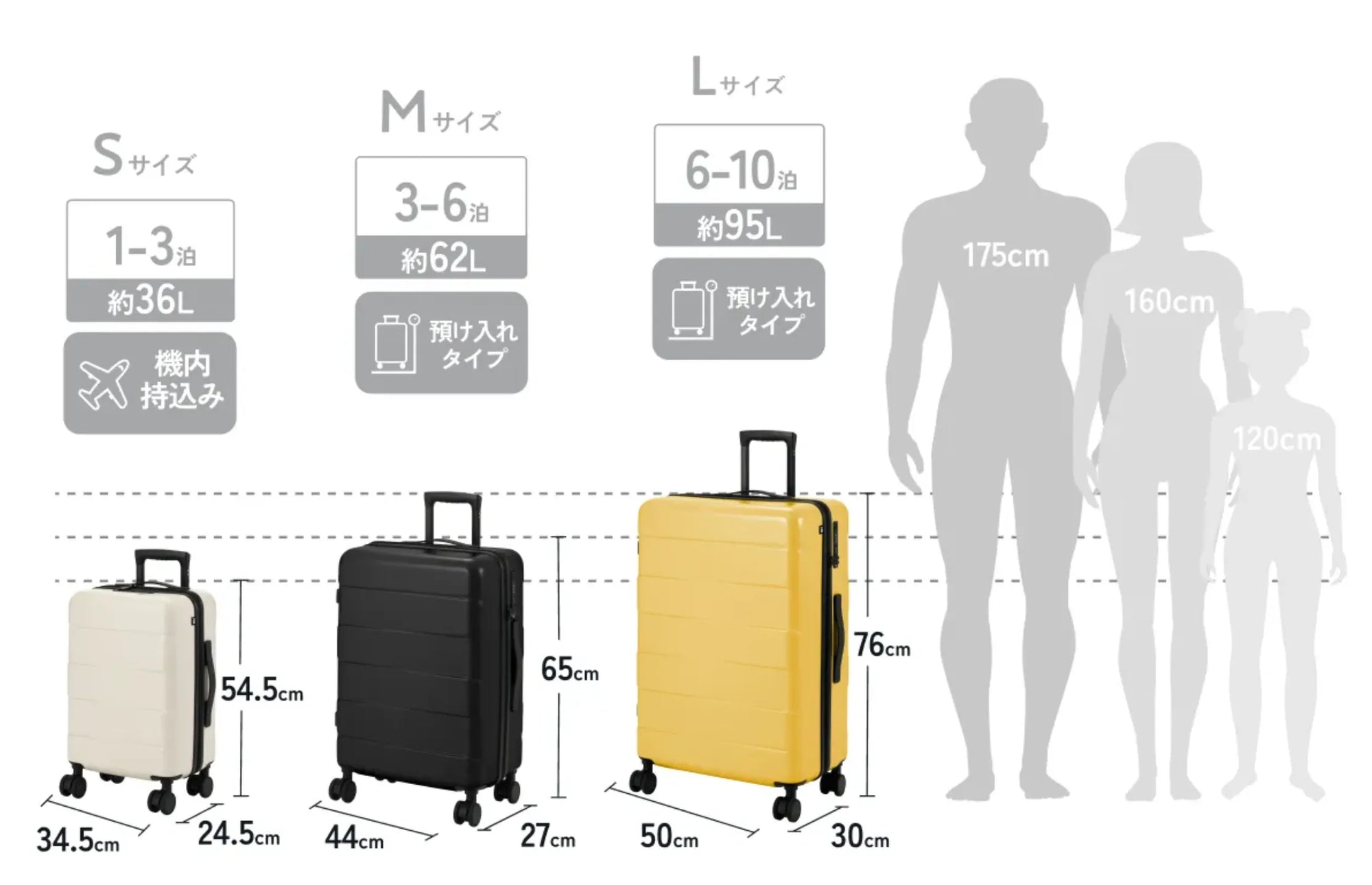 - ※Sサイズは国際線及び100席以上の国内線航空機内に持ち込み可能なサイズです。※100席以下の小型機は航空会社により持ち込み規定が異なります。事前にご利用の航空会社規定をお確かめください。