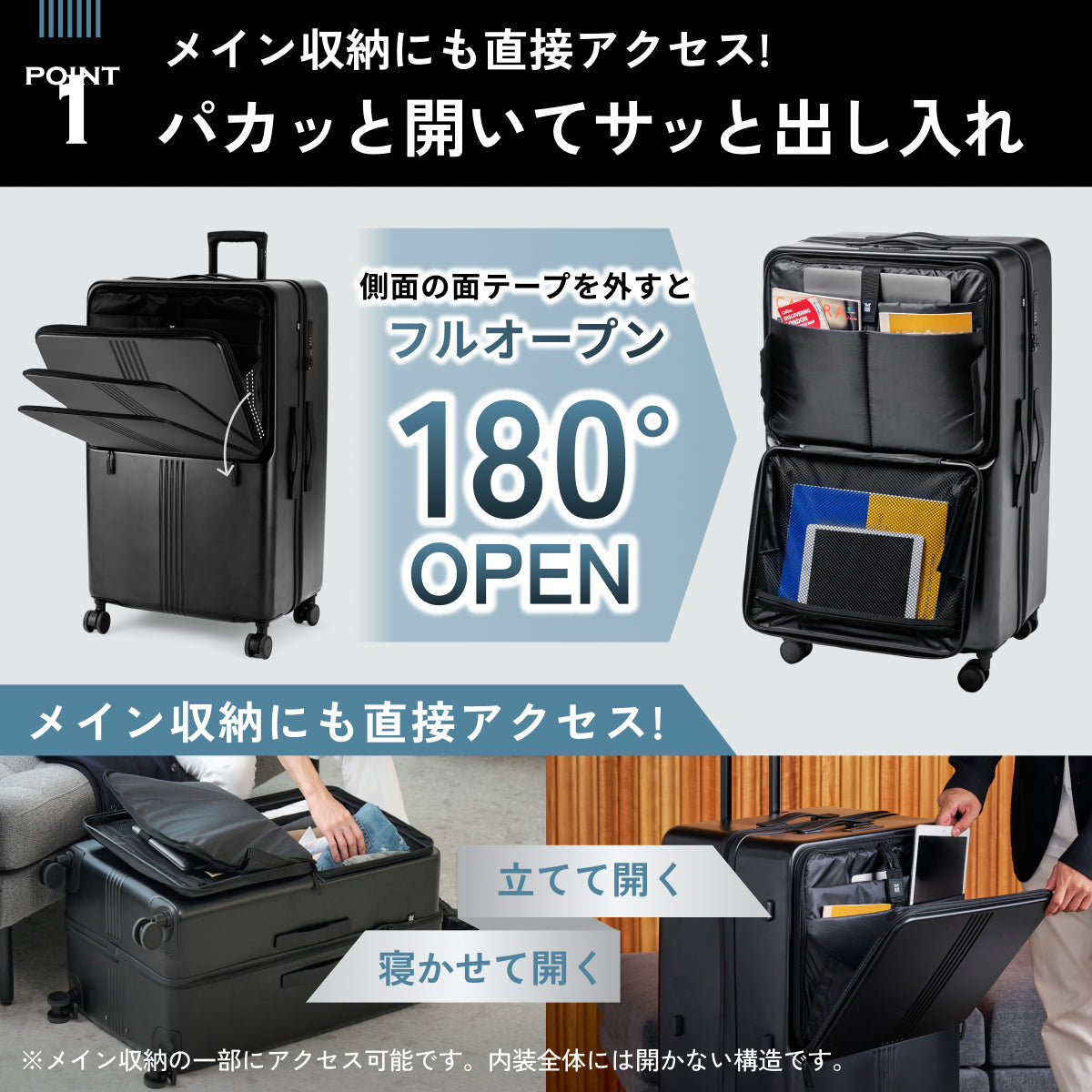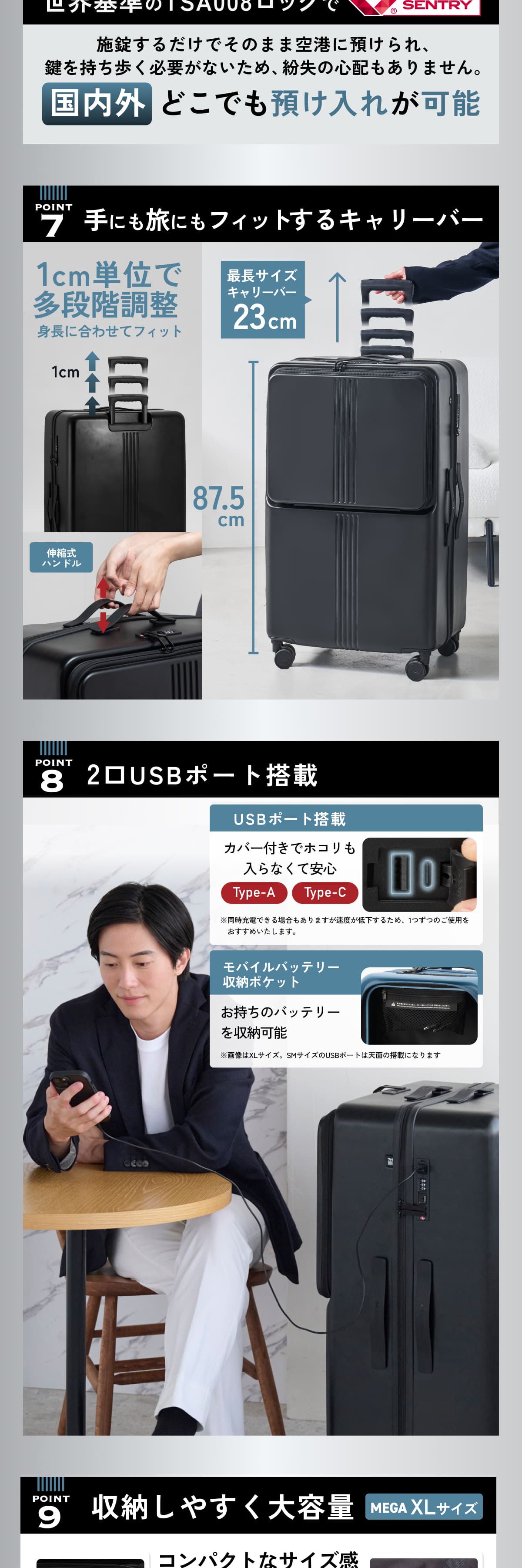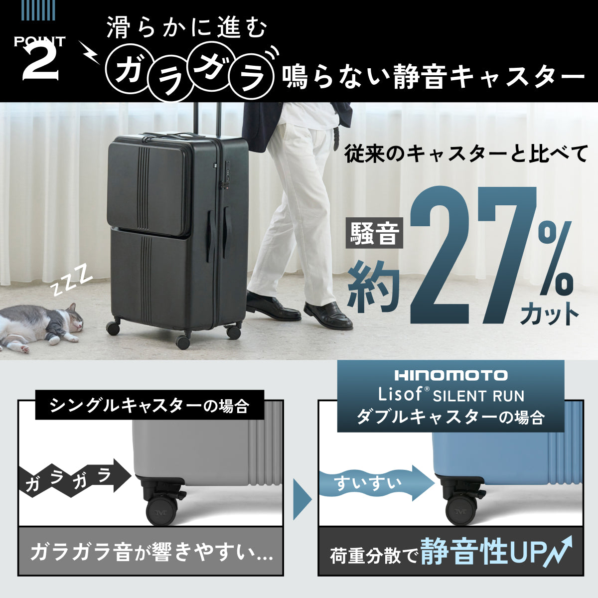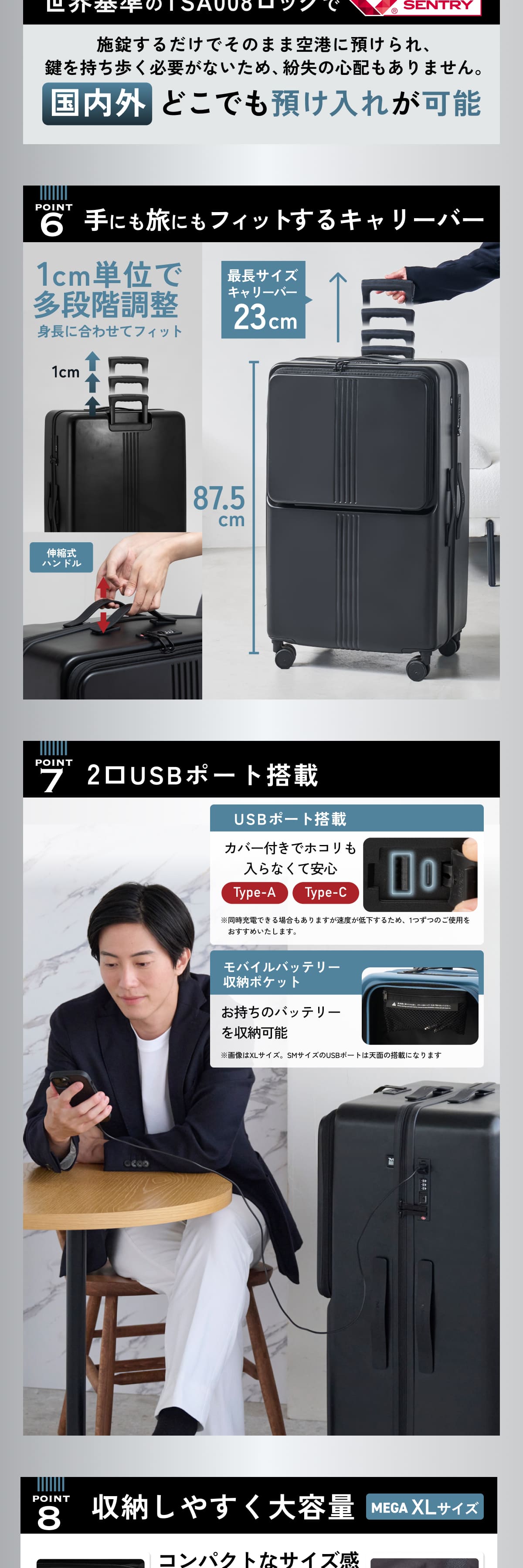 フロントオープンポケット/ファスナータイプ/TSA ロック(最新TSA008モデル)/1cm単位調節キャリバー/HINOMOTO製55mm直径静音タイヤ/取り外し可能キャスター/スペアキャスター付属/両面仕切り付き内装/マチつきポケット/クロスベルト/USB ポート2口搭載(Type-A、Type-C対応)/キャスター交換用六角レンチ付属/Q&Aつき取扱説明冊子付属/ご購入者様限定サイト