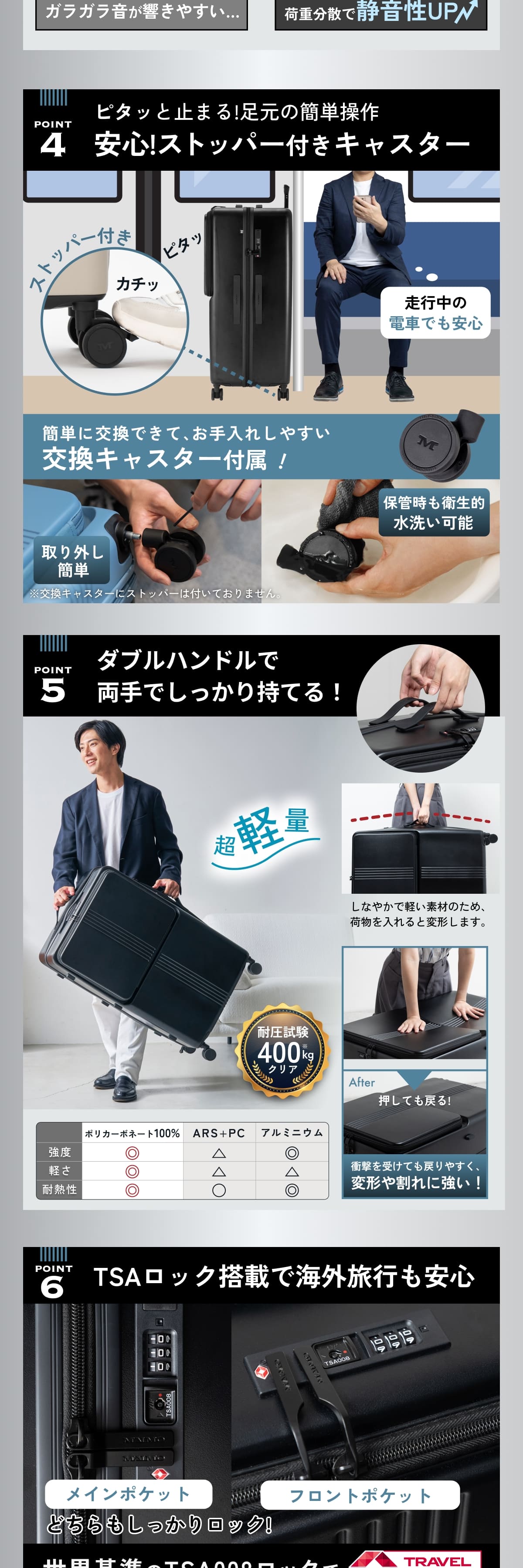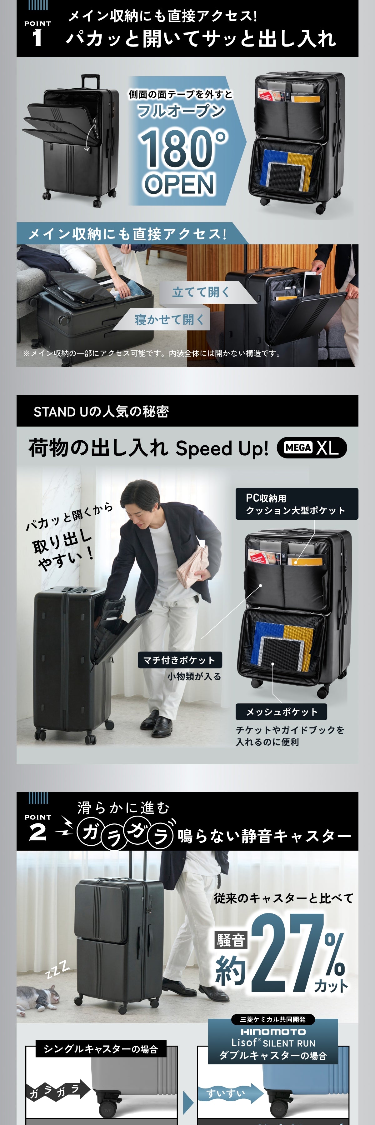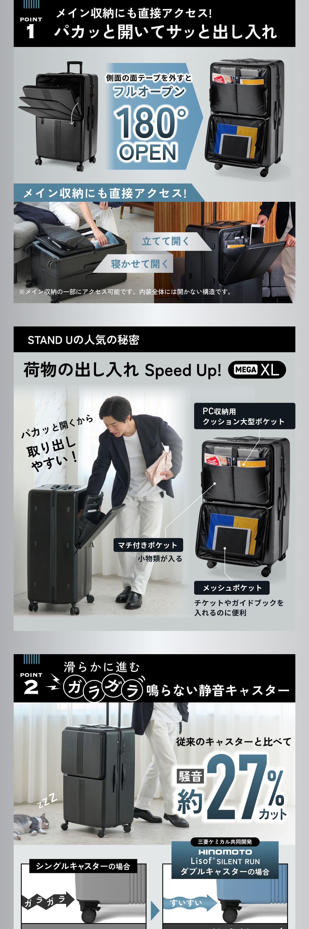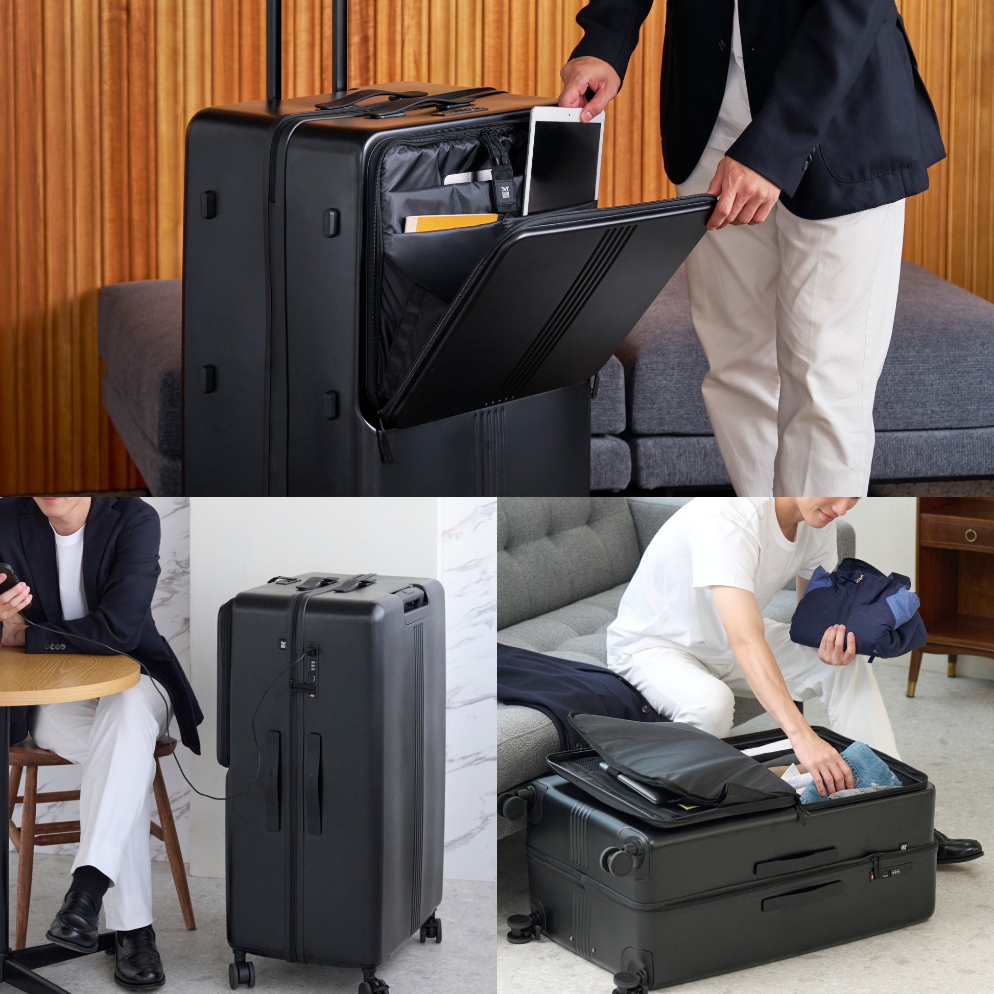 フロントオープンポケット/ファスナータイプ/TSA ロック(最新TSA008モデル)/1cm単位調節キャリバー/HINOMOTO製55mm直径静音タイヤ/取り外し可能キャスター/スペアキャスター付属/両面仕切り付き内装/マチつきポケット/クロスベルト/USB ポート2口搭載(Type-A、Type-C対応)/キャスター交換用六角レンチ付属/Q&Aつき取扱説明冊子付属/ご購入者様限定サイト