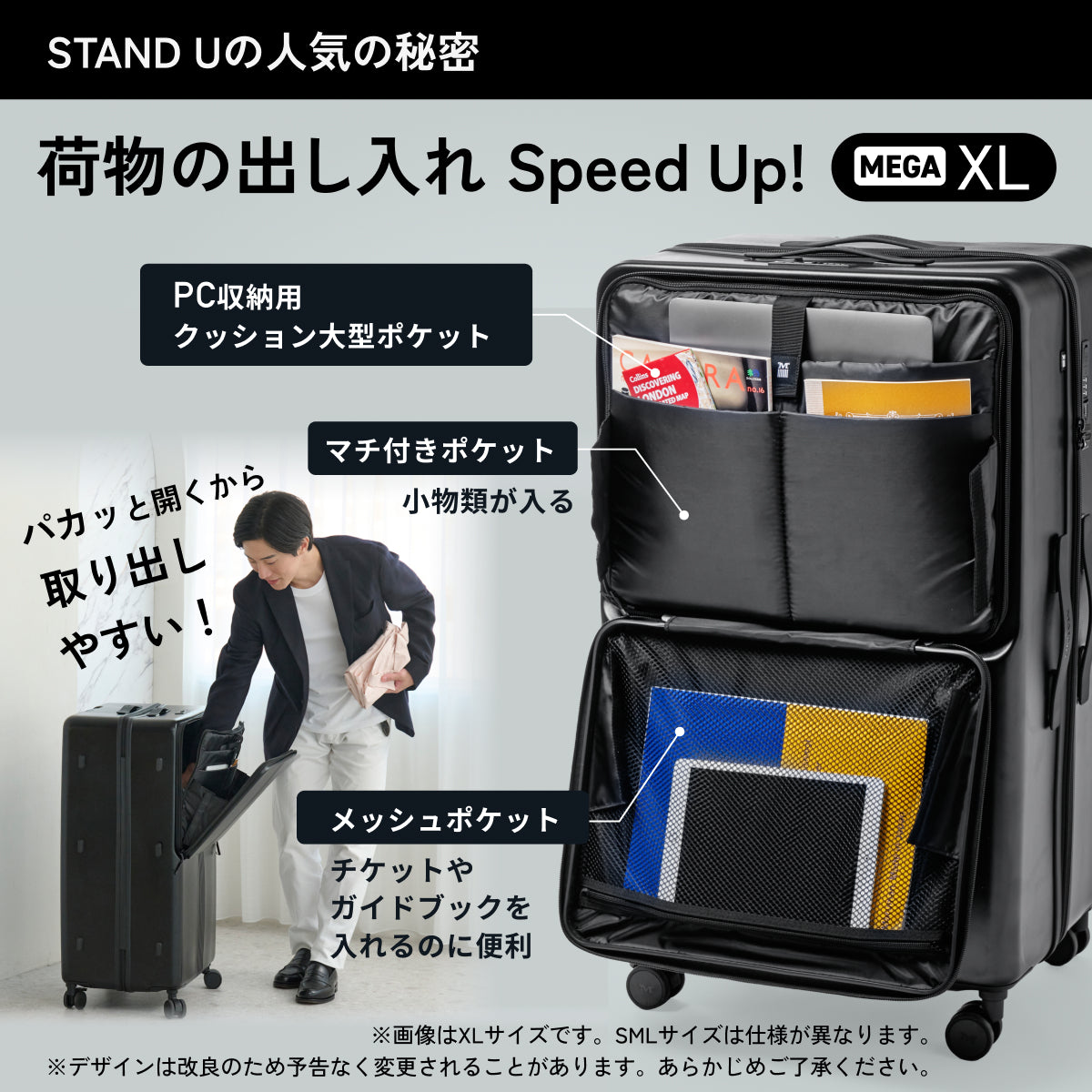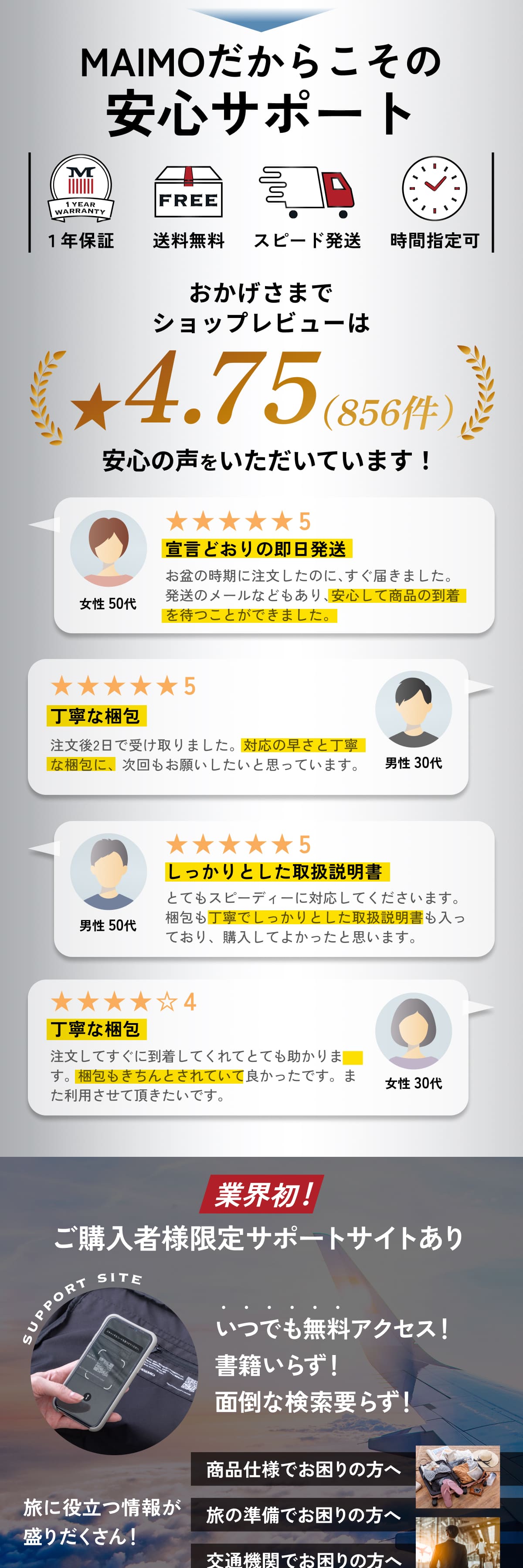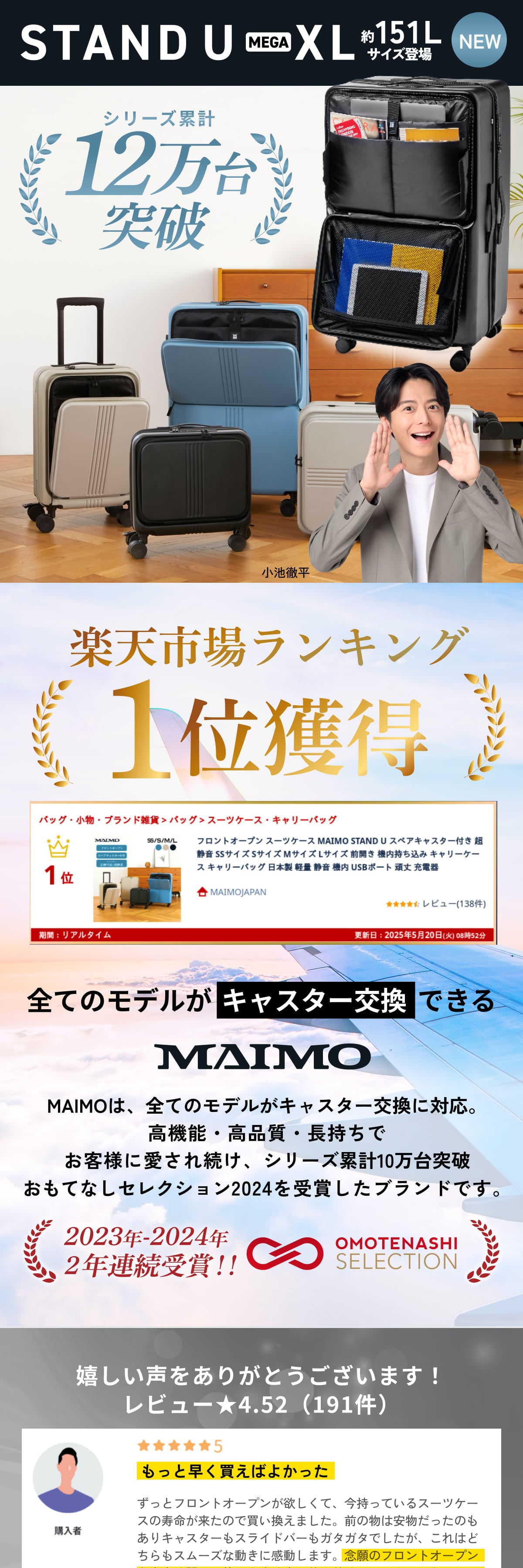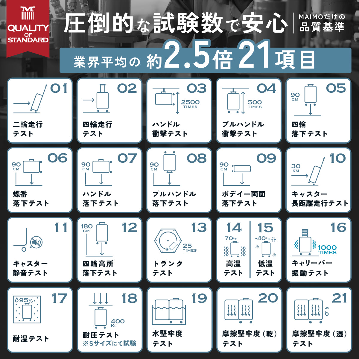 フロントオープンポケット/ファスナータイプ/TSA ロック(最新TSA008モデル)/1cm単位調節キャリバー/HINOMOTO製55mm直径静音タイヤ/取り外し可能キャスター/スペアキャスター付属/両面仕切り付き内装/マチつきポケット/クロスベルト/USB ポート2口搭載(Type-A、Type-C対応)/キャスター交換用六角レンチ付属/Q&Aつき取扱説明冊子付属/ご購入者様限定サイト