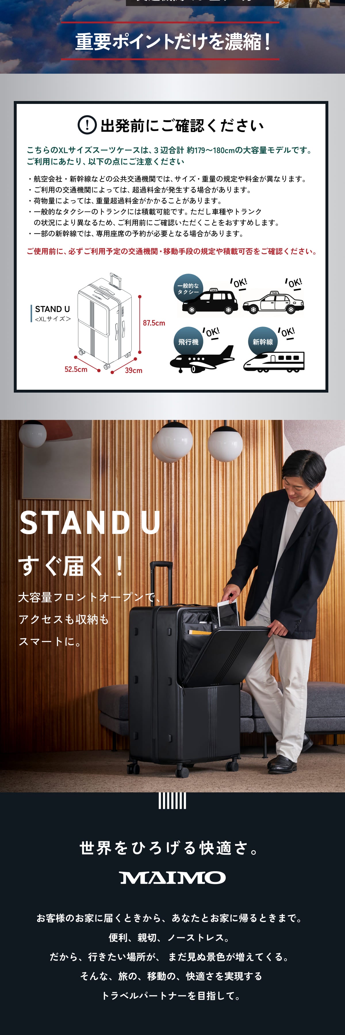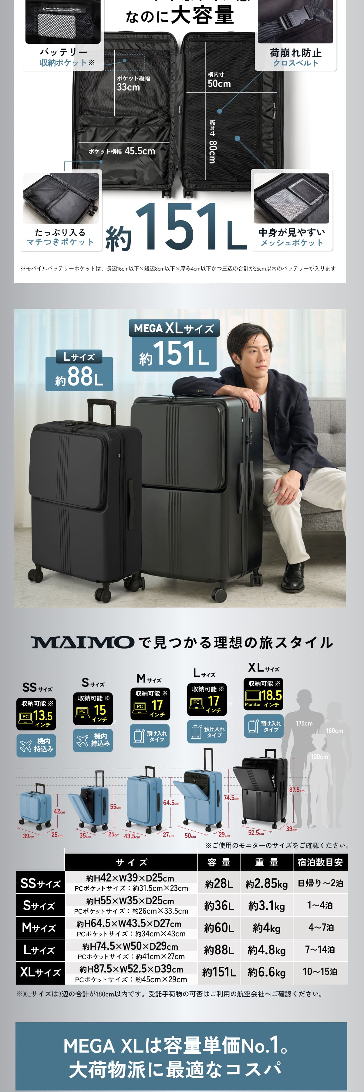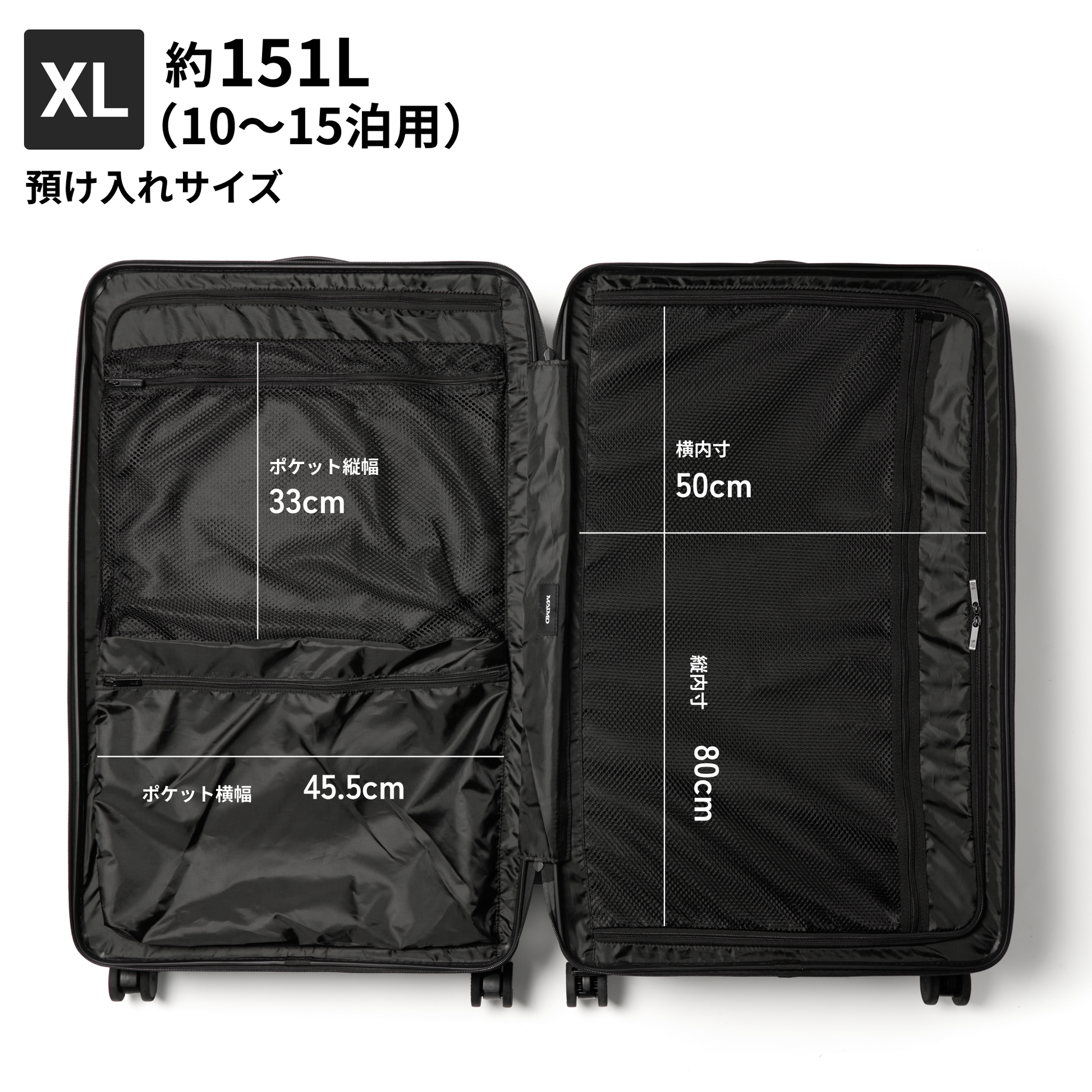 - ※XLサイズはスーツケース三辺の合計が約180cmです。ご利用の交通機関によっては超過料金が発生する場合がありますのでご利用前に必ずご確認ください。