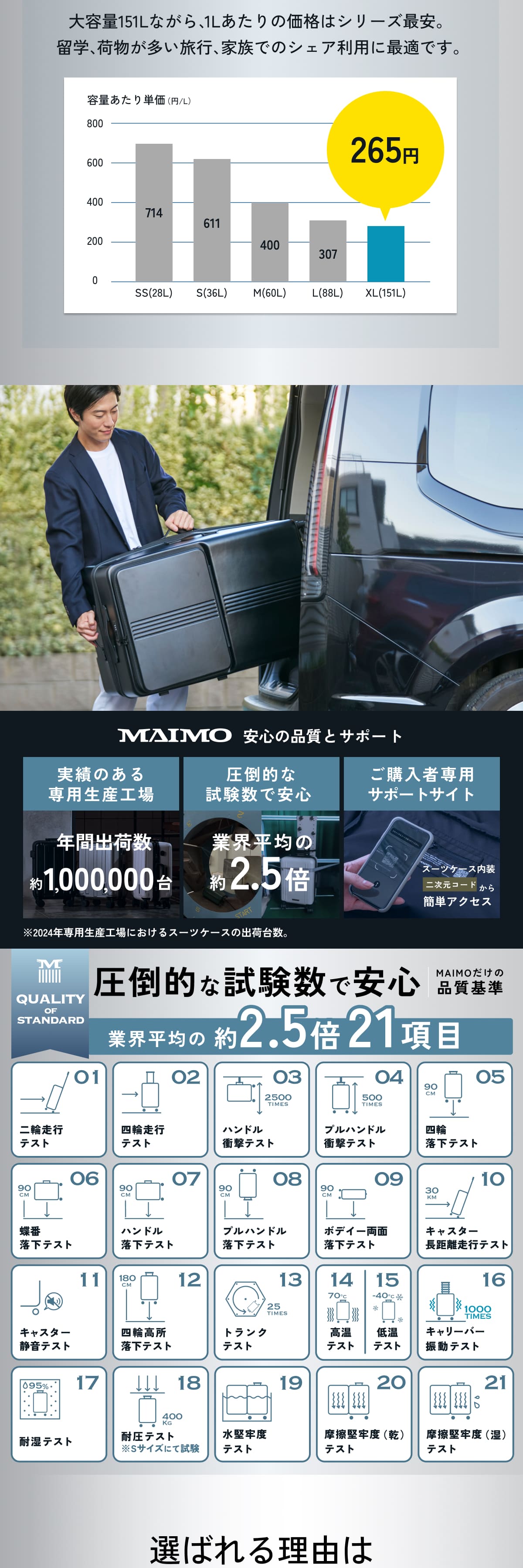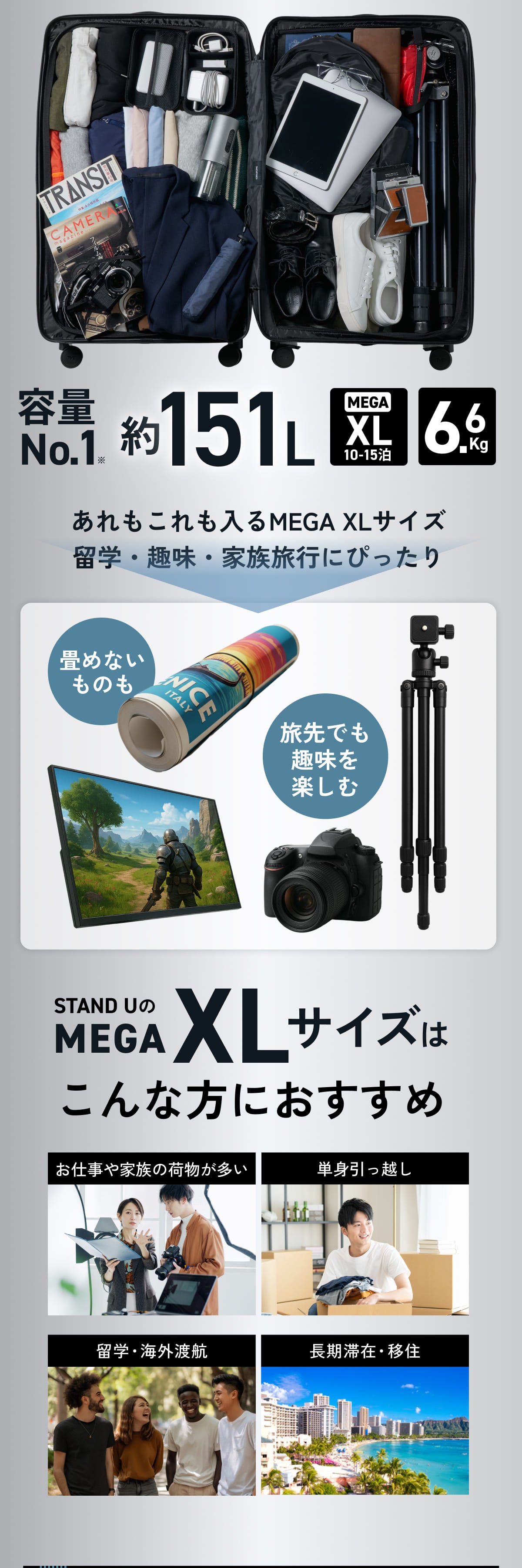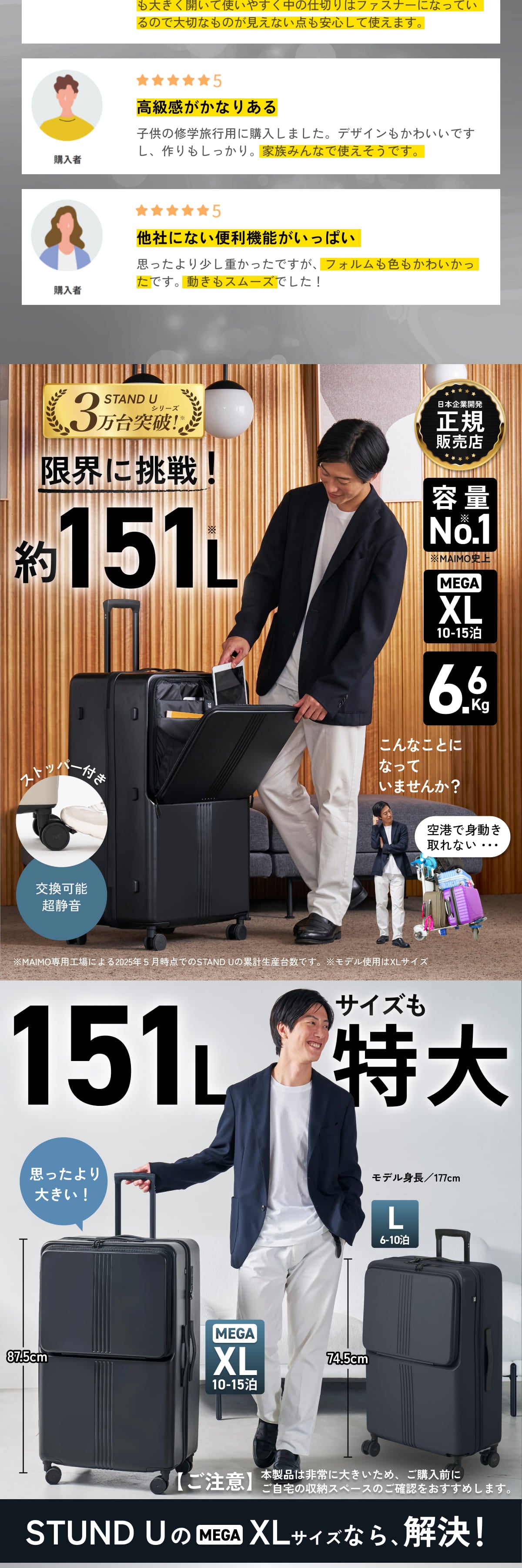 - ※XLサイズはスーツケース三辺の合計が約180cmです。ご利用の交通機関によっては超過料金が発生する場合がありますのでご利用前に必ずご確認ください。