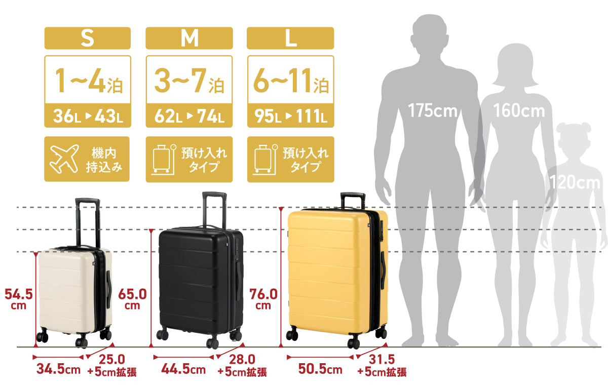 ※SS・Sサイズは国際線及び100席以上の国内線航空機内に持ち込み可能なサイズです。※100席以下の小型機は航空会社により持ち込み規定が異なります。事前にご利用の航空会社規定をお確かめください。
