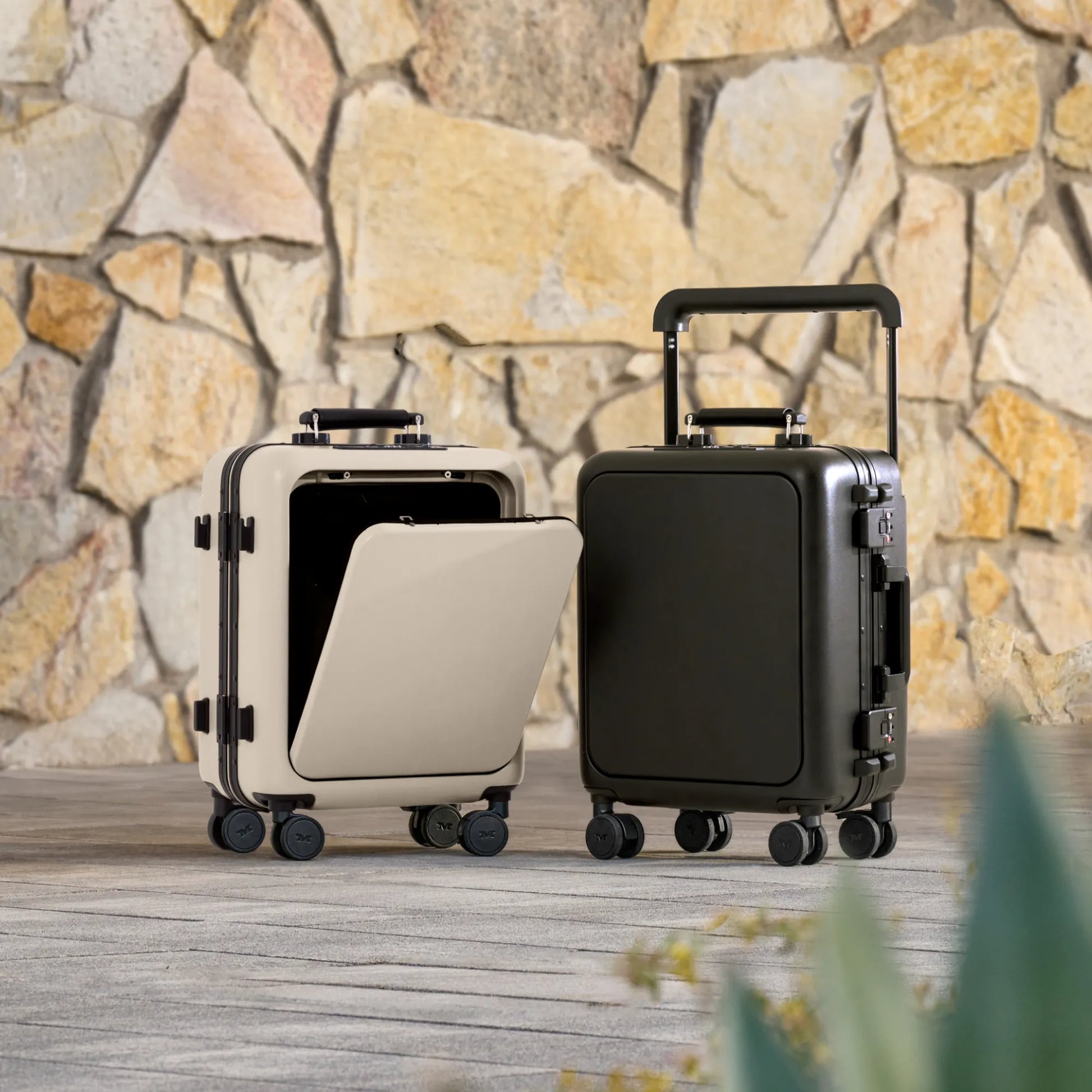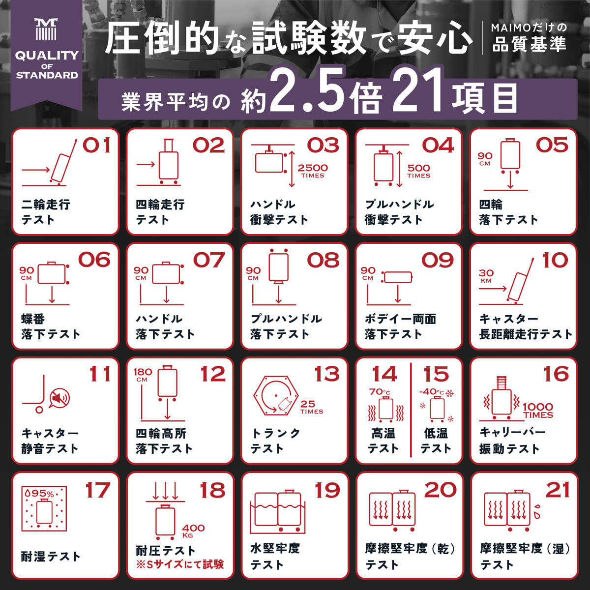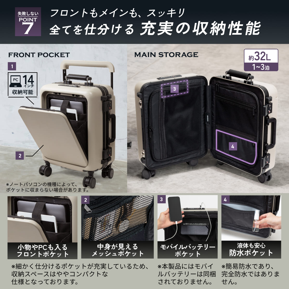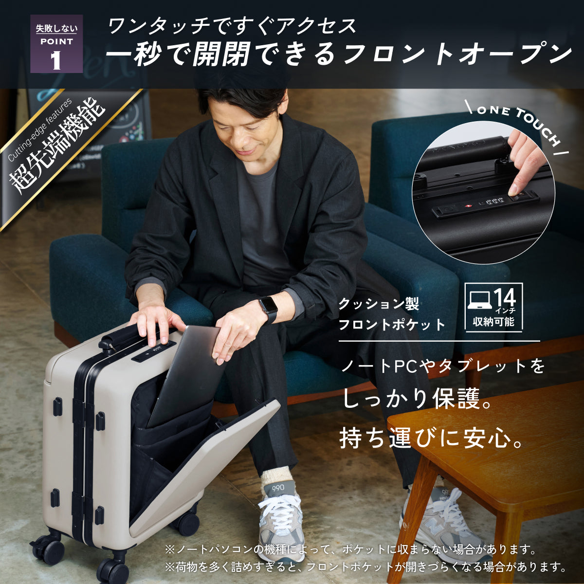 アルミフレームタイプ/ワンタッチフロントオープン/TSA ロック/ワイドキャリーバー/3段階調節キャリーバー/55mm 直径静音タイヤ/取り外し可能キャスター/キャスター交換用六角レンチ付属/ストッパー付きキャスター/カップホルダー/USBポート搭載(typeA/typeC)/Q&Aつき取扱説明冊子付属/ご購入者様限定サイト