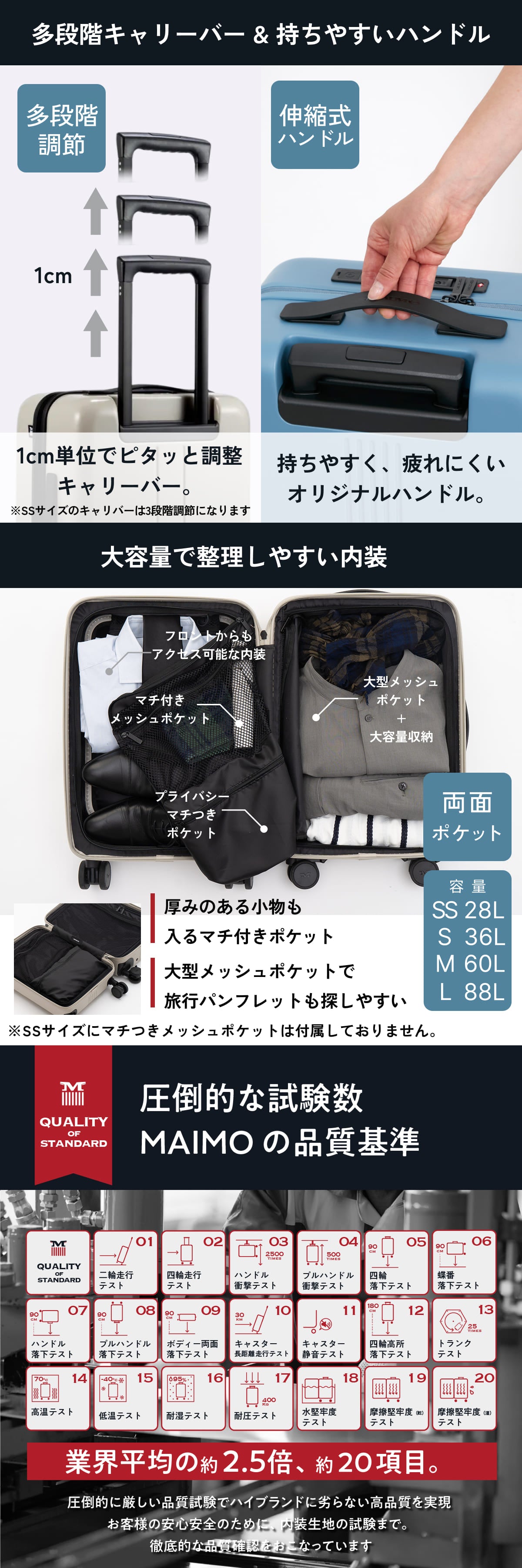 フロントオープンポケット/ファスナータイプ/TSA ロック(最新TSA008モデル)/1cm単位調節キャリバー(SSサイズは3段階調節になります)/HINOMOTO製55mm直径静音タイヤ/取り外し可能キャスター/スペアキャスター付属/両面仕切り付き内装/マチつきポケット/クロスベルト/USB ポート2口搭載(Type-A、Type-C対応)/キャスター交換用六角レンチ付属/Q&Aつき取扱説明冊子付属/ご購入者様限定サイト/キャリーバーは使用シーンや身長に合わせて調整可能