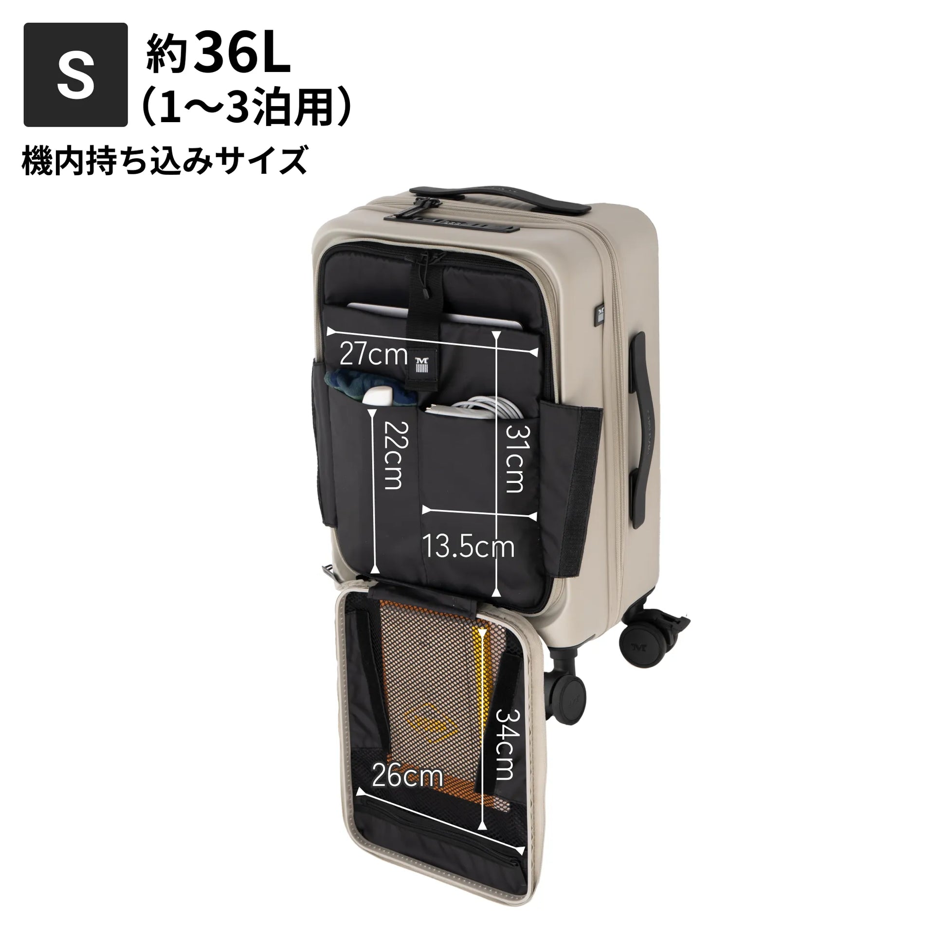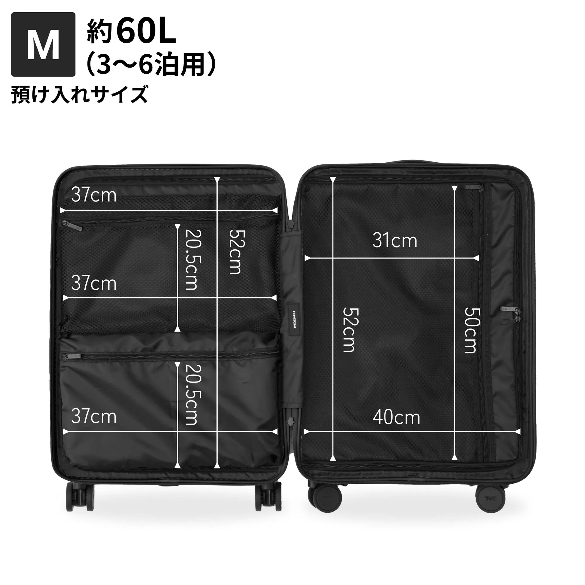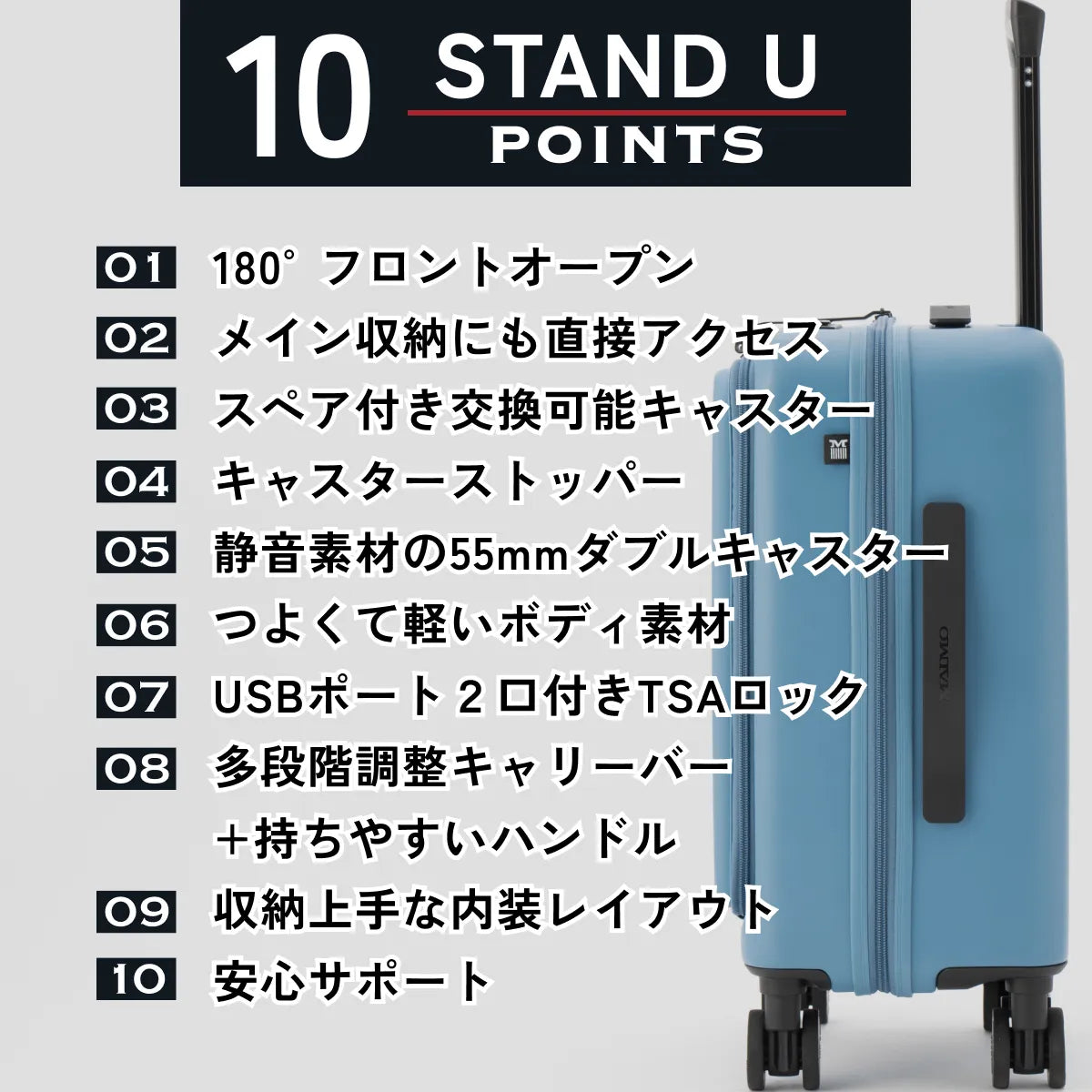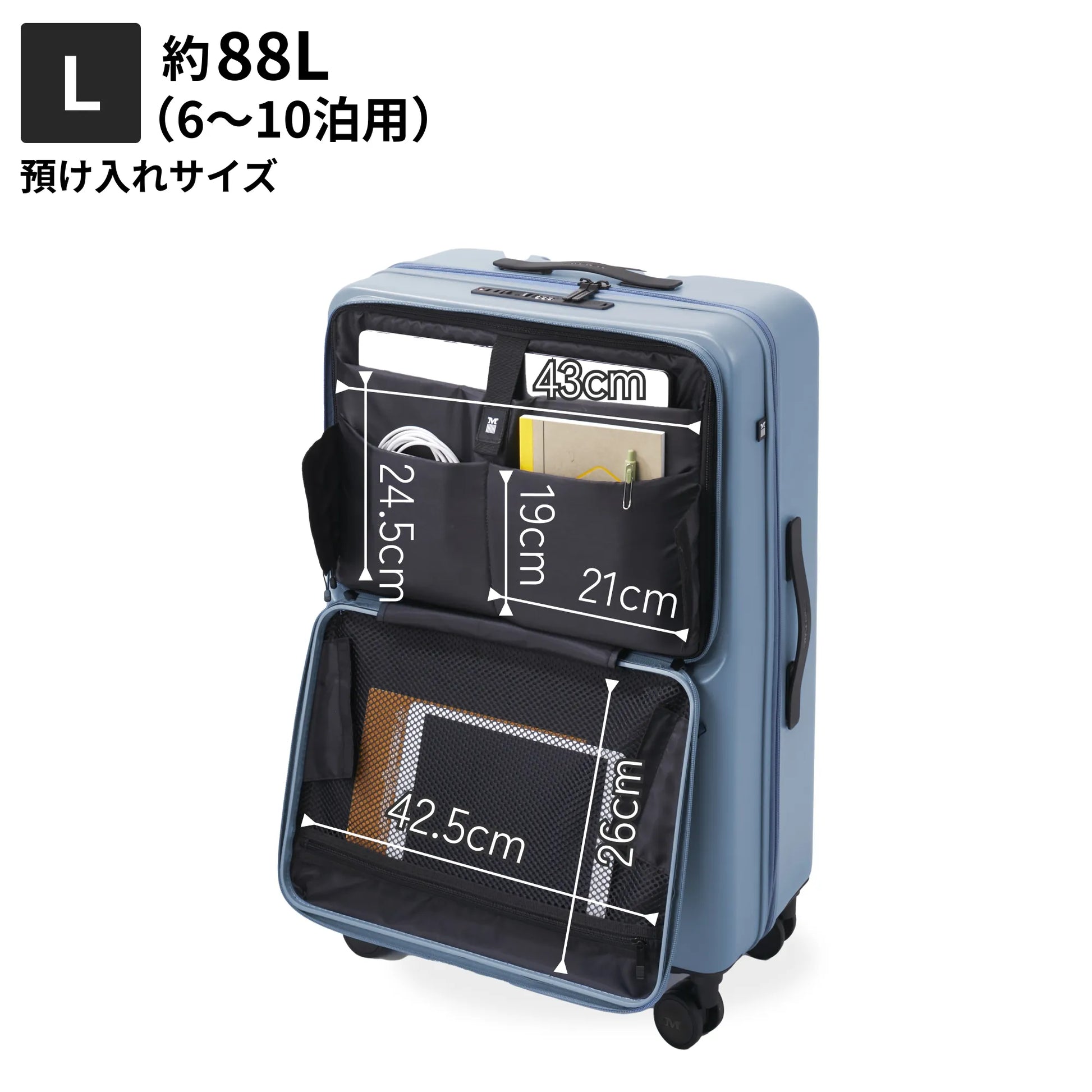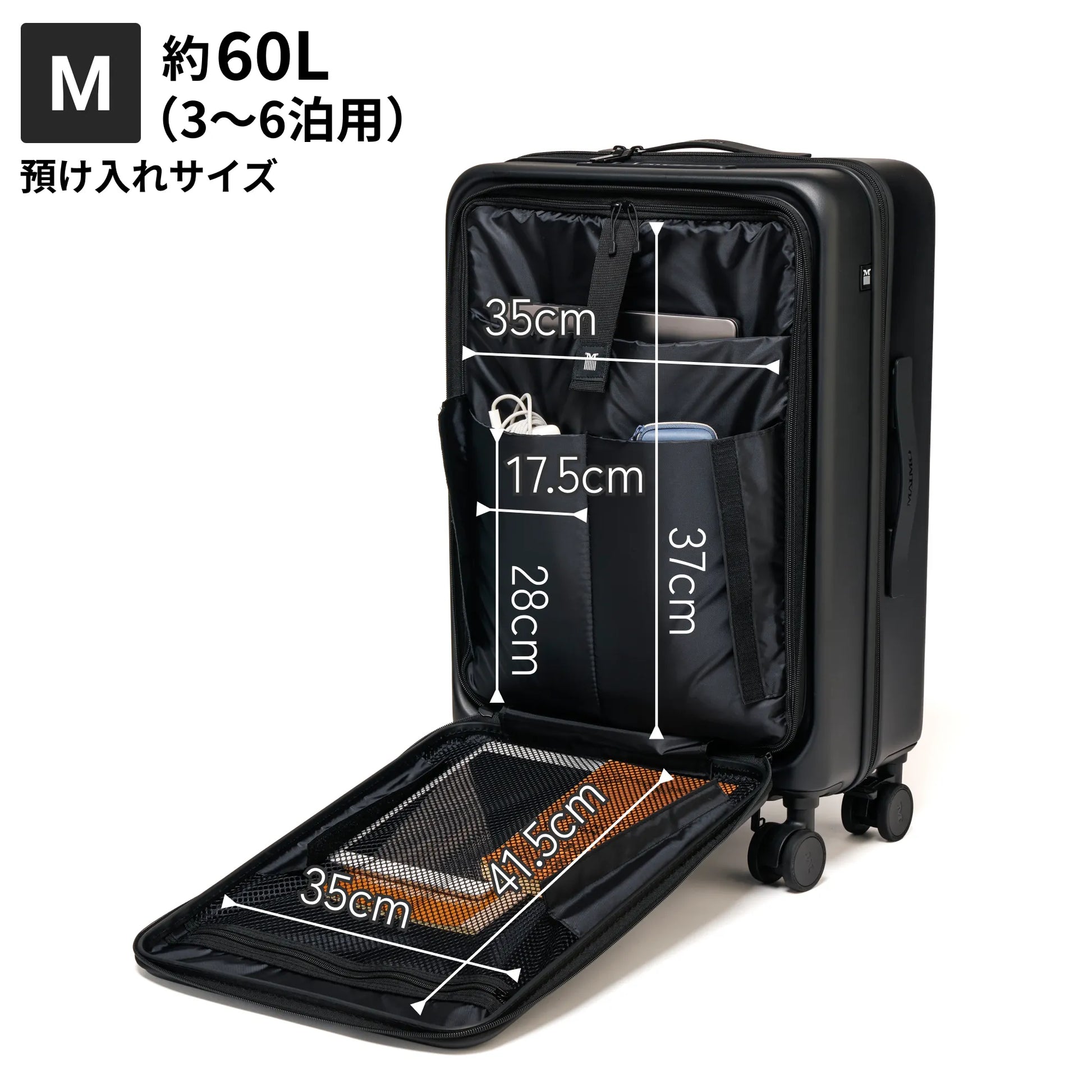 フロントオープンポケット/ファスナータイプ/TSA ロック(最新TSA008モデル)/1cm単位調節キャリバー/HINOMOTO製55mm直径静音タイヤ/取り外し可能キャスター/スペアキャスター付属/両面仕切り付き内装/マチつきポケット/クロスベルト/USB ポート2口搭載(Type-A、Type-C対応)/キャスター交換用六角レンチ付属/Q&Aつき取扱説明冊子付属/ご購入者様限定サイト